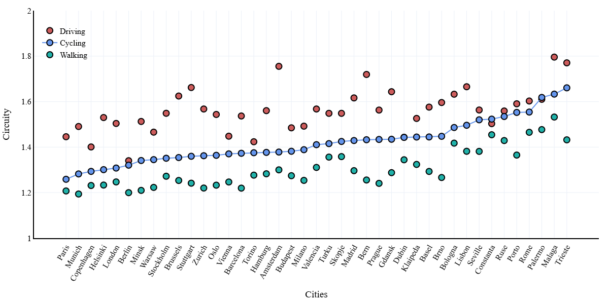 Circuity, the ratio of network distances to straight-line distances, is considered a critical measurement in urban network morphology and transportation efficiency as it can measure the attractiveness of routes in terms of distance traveled.